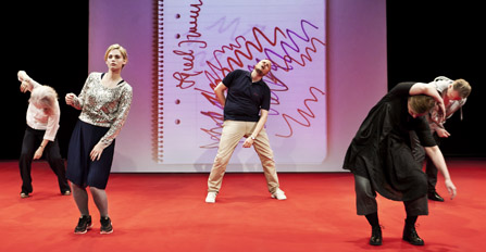 Scengolvets varmröda matta för oss osökt in i Ingmar Bergmans livmodersfixerade universum. I fonden en stor projicering av hans anteckningsblock. ”Detta är mitt block”. Scenen intas av sex skådespelare, som inför en kollationering innan de lagom avspänt börjar testa roller och djärva scenidéer. Ska jag heta Anna eller Marianne? Bergmans ständiga recycling av sina karaktärer. De nosar på textfragment och scenlösningar. Alla turas om att ta Bergmans plats, någon låter som en Liv Ullmann, en annan som en Gunnar Björnstrand. Ensemblen är inkännande mot varandra och den bergmanska tonen och fraseringarna. Självironiskt, självbespeglande och drastiskt. Några musikfragment från en fyrtotalsfilm skänker tidsatmosfär.