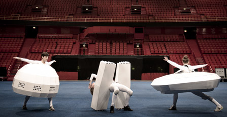 När ljuset slås syns de tre dansarna Sophie Augot, Magdalena Eriksson och Maryam Nikandish i vita kostymer, som alla liknar de arenor som finns i området. Maryam Nikandish som Globen rör sig både snabbt och värdigt över det gigantiska och smutsblå golvet men stöter snart ihop med Sophie Augot i form av den nybyggda och ännu inte invigda Tele2 Arena. Bussigast och mest livlig verkar den tredje arenan, Johanneshovs isstadion, dansad av Magdalena Eriksson vara. Den sistnämnda arenan skulle samtidigt lika väl kunna vara Söderstadion med tanke på alla anspelningar på läktarkulturer som odlas på de båda arenorna.