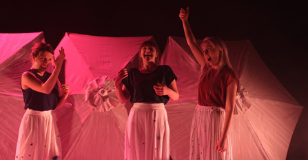 Scenerierna är väninneaktiviteter, att fläta varandras hår och sjunga hitlåtar, som I will always love you, Whitney Houston-style. I början är det svårt att avgöra graden av självironi. Publiken verkar luta åt en satirisk-komisk tolkning, särskilt i leken med feminitetsreaktioner på åskväder, dödsfall och skeppsbrott. Men det är nog på allvar, trots en del menande blickar och många milda sarkasmer från skådespelarna. Ibland är det definitivt ironi mot konventionell skådespelarkonst.