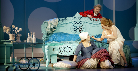 Ryske regissören Dmitri Bertman låter tidens och kärlekens efemära såpbubblor hänga i taket och etsa sig fast på sångarnas kinder, som en ständig påminnelse om den vemodigt förgängliga grundton som hela tiden befinner sig i bakhasorna på den glättiga pastellinramningen: Karamellkänslan lägrar både väggar, kläder och föder stiliserade rörelsemönster. Inledningsscenens sänghalmsrullande med fältmarskalkinnan (sopranen Charlotta Larsson) och hennes unge älskare Octavian (i byxrollen hörs mezzon Dorottya Láng) blir till exempel en exercis med situps.
