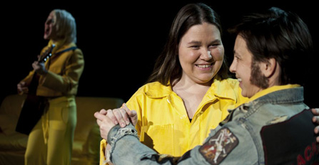 Uppsättningens anslag är som en barnbok – inledningsvis en överskådlig presentation av världen vi ska omfatta och ta avstamp från. I Josefin Hinders och Karin Gilles scenografi går Monica och Peters hem – från säng till tulipanavas – helt i gult, liksom arbetsoverallerna som fungerar som både middagsdress och pyjamas. I denna gula värld går livet på rutin tills det en dag händer något fantastiskt och övernaturligt. Gertrud Larsson använde ett liknande grepp i Försäkringskassefarsen Den flygande handläggaren, där en alltmer frustrerad handläggare förvandlades till superhjälte.