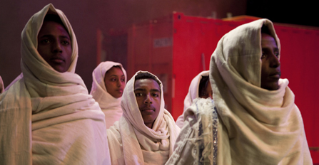 Scenografin anspelar på en hamn, och har en stor container i centrum. Phax Ahamada – Angereds pålitlige hemmaskådis tillika dansare – går en vaktmästarrunda, och tar sedan en tupplur. Då uppenbarar sig nämnda cirkusparad, följd av ett pärlband av färgstarka cirkusakter med små och stora ekvilibrister från Cirkus Debre Berhan, Addis Abeba. De är strålande samtränade och galet duktiga – en fröjd att se.
