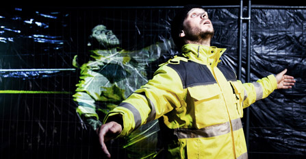 Mattias Linderoth som berättare i Yardenarbetarens yrkesuniform – gula skyddskläder, kängor med stålhätta – är ensam på en sparsamt ljussatt scen. Han omges av stålstängsel, en illustrativ sinnebild för kringskuren frihet. På stängslets platspresenning projiceras negativa videoslingor: kameraåkningar i svartvitt från kajer, havsvågor, industriområden och stadsgator.