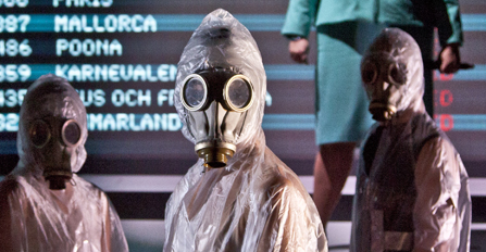 Moomsteatern goes site specific. Nåja, kanske inte helt. Men när man flyttar in i Överskottsbolagets urblåsta lokal i Malmö är inredningen konceptuell. Det är en flygplats med flygplatskänsla, kassorna förvandlade till gater och avresetavlan full av flighter med nummer 666 och destination Helvetet.