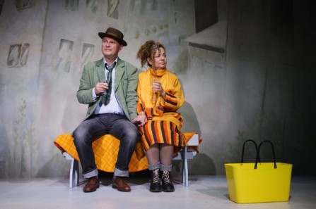 Scenografin är befriande enkel. Det förekommer en bänk, ett trebent bord och ett antal resväskor. Små miniatyrdörrar får representera lägenhetsdörrarna i hyreshuset där alla bor. Videoanimationer, som ser ut att vara handmålade, kan visa höghus i omgivningen, fallande höstlöv eller en gardin som blåser i vinden. Fantasifulla kostymer förstärker karaktärernas förvirring.