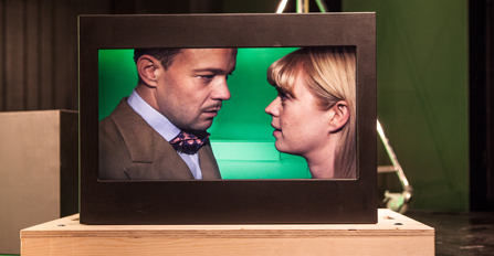 Publiken möts av ett grönt scenrum, en upplyst salong och, centralt ovanför scenens framkant, en filmduk. På duken ser vi inledningsvis rörliga bilder från sminklogen. Här etableras redan från början att det är dags att leka med metateaterperspektiven så att det bara visslar om det.