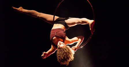 Hela kompaniet är hela tiden kollektivt och konstnärligt närvarande i så gott som samtliga nummer – med dans, humoristiska kommentarer, ibland som moraliskt stöd vid en särskilt svår uppgift – men ändå ser det länge ut som om Sequence 8 ska bli en historia om män som gör helt oetmotståndliga och helt obegripligt svåra saker. Ja, jag hinner nästan sitta och genussurna en smula, men så kommer som tur är Camille Legris och Tristan Nielsens förträffliga paraktrobatiknummer och – som pricken över i – Alexandra Royers magiska dans med luftringen till varligt cellokomp och med en av kamraterna som rörlig strålkastarbärare.