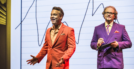I mockaskor och grälla kostymer intar en solbränd Henrik Schyffert (rosa) och Fredrik Lindström (lila) scenen. Med sig själva som exempel vill de måla upp bilden av privilegierade nyrika, höginkomstintagare i ett land som klarat finanskrisen väl, medelklass som lever i ett slags genvägssamhälle, som försöker göra så lite så möjligt för så mycket som möjligt. Brun utan sol, smal utan träning, karriär utan utbildning, osv.