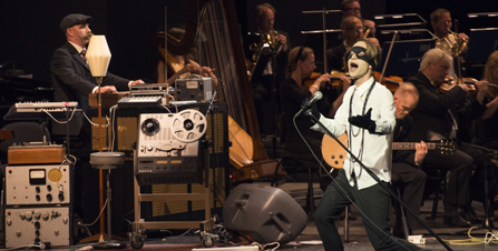 Om vi backar tillbaka, så börjar konserten med att dirigenten Jonas Nydesjö (medvetet) dröjer ovanligt länge med att inta pulten. Två instrumentala stycken spelas innan bandet – Jonas Jonasson på klaviatur, Conny Nimmersjö på gitarr, Johnny Essing på gitarr, Mats Hellquist på bas, Christian Gabel på trummor – intar sina positioner i orkestern. Stämningen är lite stillastående, och de statiska videoprojektionerna gör inte mycket väsen av sig. Tomas Öberg gör i princip inte mycket mer än att vanka fram och tillbaka längs scenkanten i sin ögonmask och då och då avfyra outgrundliga leenden. Efter ett tag kompletteras hans utstyrsel med en fjäderskrudad huvudbonad ur operans kostymförråd.