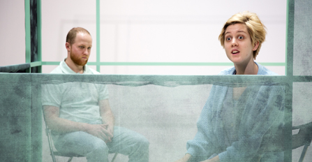 Scenograferna Veine Bartos och Jonathan Wahlstedts kub för tankarna till de romska läger som byggs upp och rivits ner och fungerar också som socialkontorets avhumaniserade rum med dörrar där personalen kan fly om det blir farligt.