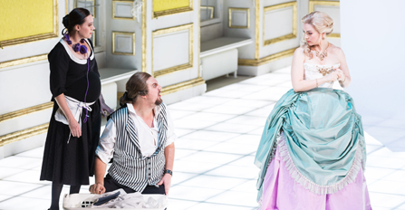I Figaros bröllop är vi tillbaka på operan, med orkestern i diket och en traditionell ridå. När den går upp badar scenen i starkt ljus. Där sitter grevinnan och greven vid ett långt bord, hon försöker uttråkad fånga hans uppmärksamhet, han läser El Pais. Johan Rydh assisterar som högdragen butler – han kunde vara mister Carson i tv-serien Downton Abbey. Klassperspektivet är ständigt närvarande. Herrskapet bär pastell och tjänstefolket kånkar på strykbräden och tvättkorgar. Scenbilden är en sal med guldgula sidentapeter och höga fönster, där de långa gardinerna ger möjlighet till sista aktens kurragömmalek i parken. En stor kassavalvsdörr i fonden öppnas ibland och där bakom anas ett kompakt mörker.