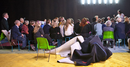 Här är det teatern/ensemblen själv som, på samma scengolv, vill lära känna sina besökare, närma sig i närkontakt av åtminstone andra graden – ett mingel skådespelaren Jörgen Thorsson rättframt sammanfattar som ”ändå lite pinsamt”.