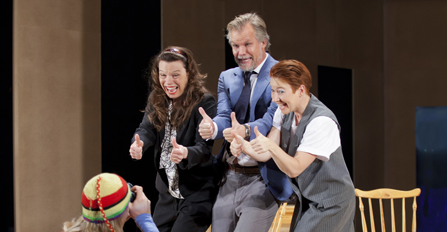 Pjäsen framstår som ett pratstycke riktat mot en kommenterande kör, här placerad som en osynlig åhörare i skyn. Charlotta Nylunds scenografi med stramt centralperspektiv begränsar mer än den lyfter spelet. Öllegård Goundstroems regi rår inte på materialet. Tematiken fransar ut, komiken föder få skratt och satiren tar aldrig riktigt skruv. Att ta till strykjärnet i kapitalisternas märkliga nattvardsscen, blir snarast ett tecken på kreativ desperation.