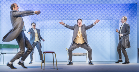 De svävande måsarna i det skira blå – och måsskiten på de festklädda Klunganmedlemmarns axlar. På rätt sida om okej, humorgruppens tredje samarbete med Birgitta Egerbladh, rör sig däremellan. Från den himmelsblå scenografin, vars uttryck är lånat från Royal Copenhagen-servisen Blå Måsen, till det där som också är måsar: Enstaka fina skrin som tätnar till fågelskrän av Hitchcockdensitet.