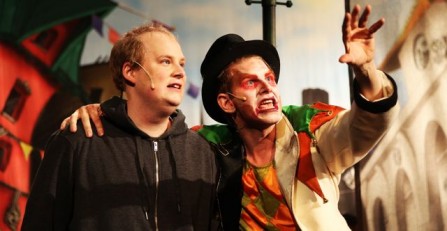 Till vänster hemmet med Anna Hannings slitna mamma, till höger en skola i grått, vitt och svart – bildligt och bokstavligt – där regelrätt mobbning ledd av magister Christer (Jan Löfgren) pågår. I mitten en öppning mot den andra världen Sajnigi (esperanto för förställa) där färgerna är starka och klara, ingenting är rätlinjigt och Håkan Borgstens skönt tvetydiga narr Buffon huserar. Han är huvudpersonen Felix’ inre röst som tröstar och hjälper men också blir farlig. Det är också nära Sajnigi, bakom den halvgenomsiktliga väggen som musikerna finns – en fin scenografisk lösning av Jens Gustavson.